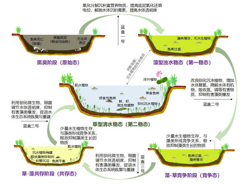 黑臭階段(原始態(tài)),氧化分解沉積富營(yíng)養(yǎng)物質(zhì),提高底泥氧化還原電位,解除水體沉積毒素,提高水體透明度;藻型濁水穩(wěn)態(tài)(第一穩(wěn)態(tài)),改良馴化沉水植物,增加水體復(fù)氧,降解水體有機(jī)物,吸收氮、磷等有害物質(zhì),抑制有害藻類爆發(fā);藻-草競(jìng)爭(zhēng)階段(競(jìng)爭(zhēng)態(tài)),少量水生植物生存,與藻類形成競(jìng)爭(zhēng)關(guān)系,釋放抑制藻類生長(zhǎng)的物質(zhì),利用馴化微生物、細(xì)菌調(diào)節(jié)水體透明度,抑制有害藻類爆發(fā),促進(jìn)水體生態(tài)系統(tǒng)恢復(fù)與重建;草-藻共存階段(共存態(tài)),少量水生植物生存,與藻類形成競(jìng)爭(zhēng)關(guān)系,釋放抑制藻類生長(zhǎng)的物質(zhì),利用馴化微生物、細(xì)菌調(diào)節(jié)水體透明度,抑制有害藻類爆發(fā),促進(jìn)水體生態(tài)系統(tǒng)恢復(fù)與重建;最終形成草型清水穩(wěn)態(tài)(第二穩(wěn)態(tài))。適用于湖泊、水庫(kù)、景觀水體等。