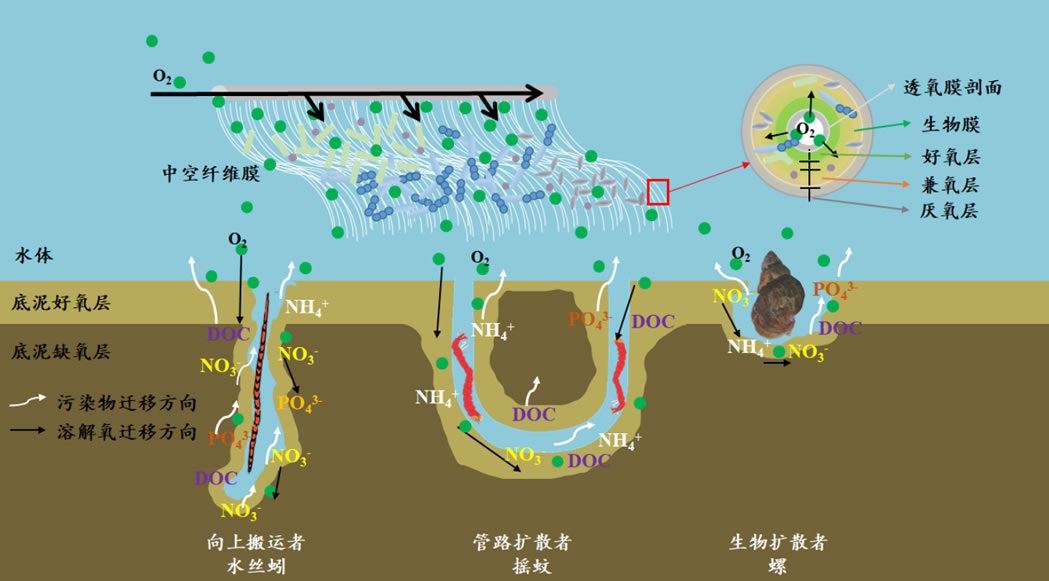 工藝利用優(yōu)勢底棲動物蘇氏尾鰓蚓耦合微納米孔氣體分離膜與無泡透氧生物膜,通過優(yōu)勢底棲動物對黑臭淤積底泥進行擾動,形成污染物在上覆水和底泥中的遷移轉化,引起沉積物微環(huán)境和微生物豐度、多樣性及群落結構的變化;利用孔徑為0.1-1μm的均質膜,該膜氧傳質效率是普通曝氣的3倍以上,能耗降低40%,通過膜表面微孔結構實現微納米曝氣,為上覆水提供穩(wěn)定的氧氣供應,改善溶解氧;無泡透氣生物膜比表面積達500m2/m3,微生物負載量提升3倍以上,形成內層好氧、外層缺氧的雙功能區(qū),好氧層完成氨氮的硝化,缺氧層利用碳源進行反硝化,同時生物膜內的聚磷菌通過厭氧釋磷和好氧吸磷實現除磷。建立內源污染的“底棲擾動釋放-界面微環(huán)境重構-微生物群落結構改變-內源污染的削減與水質提升”關系模式,完成內源污染原位強化削減。適用于河道、內河底泥黑臭治理;湖泊、水庫內源污染治理。