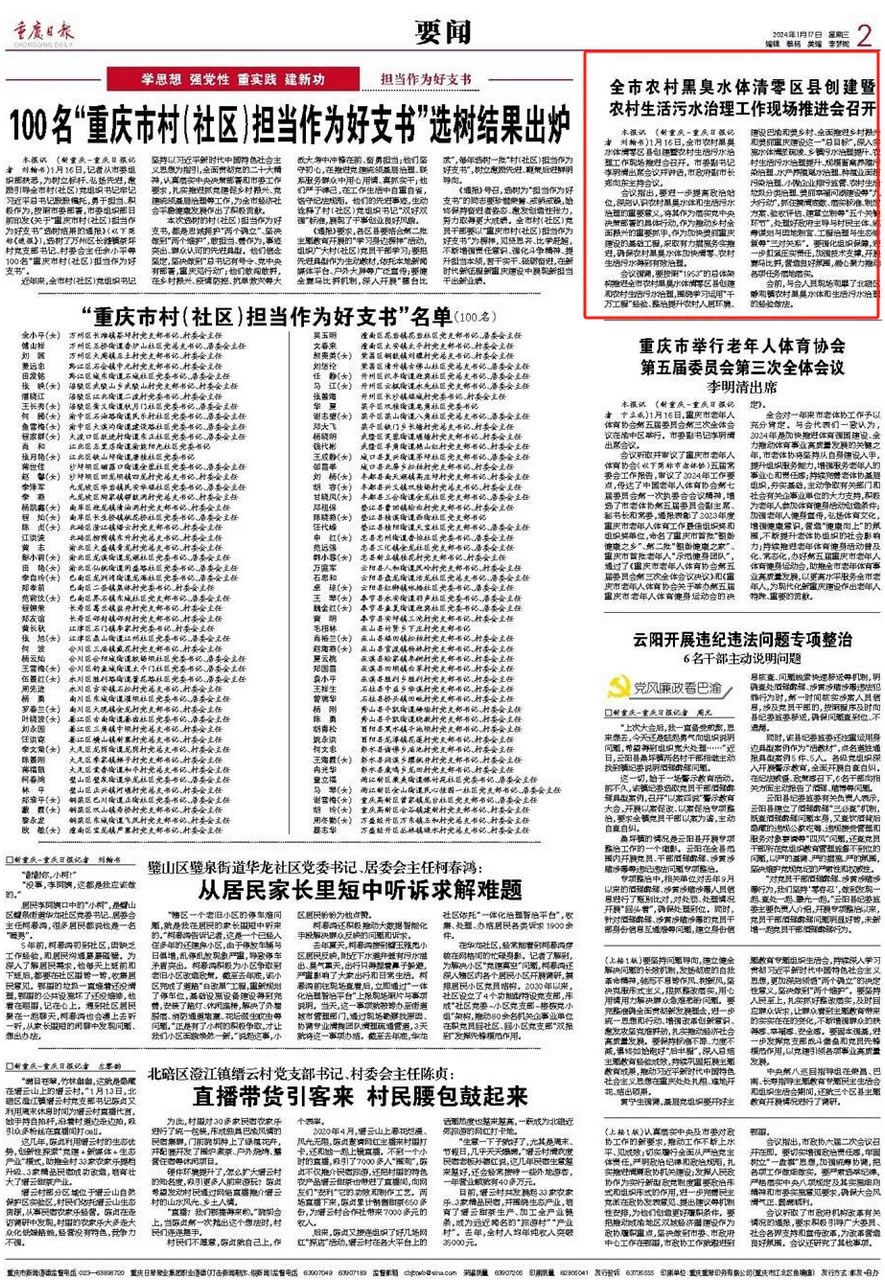 2024年1月17日,《重慶日報(bào)》第002版發(fā)表了《全市農(nóng)村黑臭水體清零區(qū)縣創(chuàng)建暨農(nóng)村生活污水治理工作現(xiàn)場推進(jìn)會(huì)召開》。