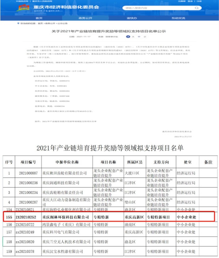此次榮獲重慶市“專精特新”項(xiàng)目支持企業(yè),不僅是對閣林環(huán)保研發(fā)創(chuàng)新能力的肯定,更是對公司技術(shù)實(shí)力、產(chǎn)品能力、服務(wù)水平、品牌影響力、發(fā)展前景等方面的高度認(rèn)可。