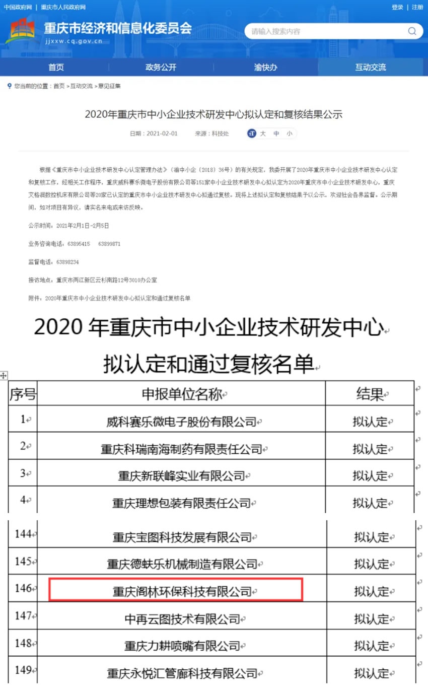 - 【喜訊】閣林環(huán)保被擬定為2020年重慶市中小企業(yè)技術(shù)研發(fā)中心