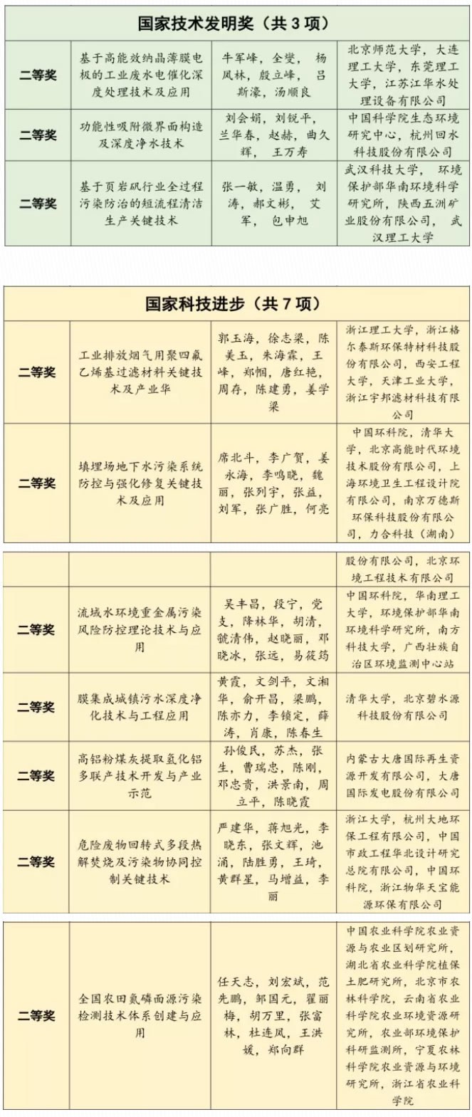 環(huán)境領(lǐng)域全部的國(guó)家科學(xué)技術(shù)獎(jiǎng),一共有13項(xiàng)(占獲獎(jiǎng)總數(shù)近5%),包括3項(xiàng)國(guó)家自然科學(xué)獎(jiǎng)、3項(xiàng)國(guó)家技術(shù)發(fā)明獎(jiǎng)和7項(xiàng)國(guó)家科技進(jìn)步獎(jiǎng),涉及水污染控制、廢氣處理、土壤修復(fù)、固廢處理、清潔生產(chǎn)等多個(gè)分領(lǐng)域。