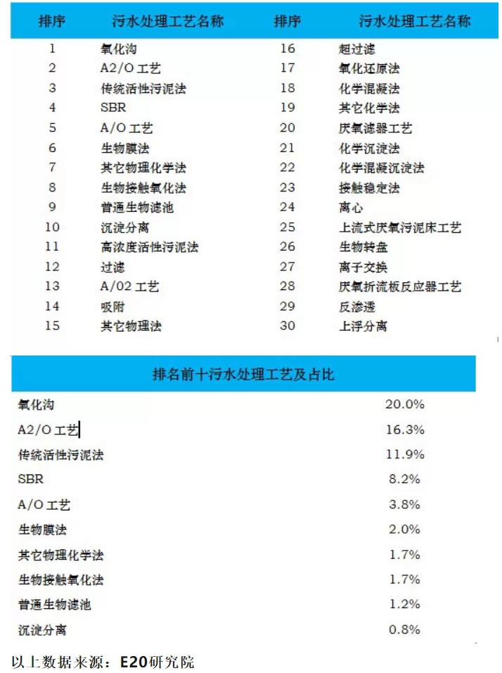 據(jù)不完全統(tǒng)計(jì),全國范圍內(nèi)已建成運(yùn)營的污水處理廠數(shù)量約4000座,這其中有統(tǒng)計(jì)數(shù)據(jù)的污水處理工藝大約30種左右,E20研究院統(tǒng)計(jì)各類技術(shù)工藝,排名如下文所示: